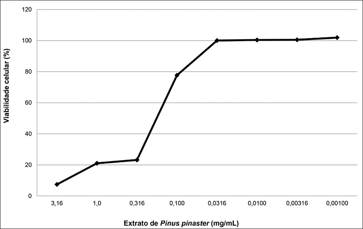 A figura 1 representa a curva de viabilidade celular para o EPP. O produto apresentou concentrações não citotóxicas a partir de 0,100mg/mL.