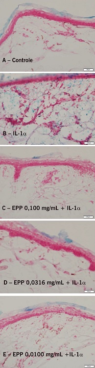 A figura 2 representa a avaliação histológica de hemossiderina pela técnica Perls’ Prussian Blue em fragmentos de pele humana obtidos de cirurgia plástica eletiva, incubados com EPP e submetidos ao estresse inflamatório com IL-1α. A figura 3 representa a semiquantificação desse pigmento.