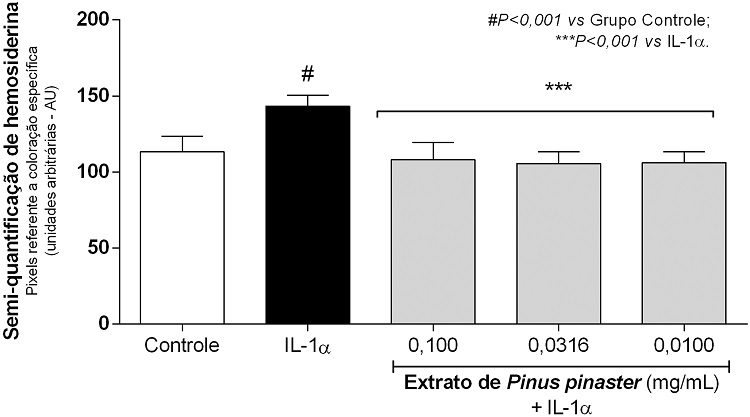 Conforme podemos observar, os fragmentos de pele expostos à IL-1α apresentam uma densidade de hemossiderina 26,6% maior em comparação ao grupo controle (P<0,001; Figura 3). No entanto, os fragmentos de pele incubados com EPP e expostos ao microambiente inflamatório mostram reduções significativas na deposição de hemossiderina quando comparados ao grupo somente exposto à IL-1α. As reduções observadas foram de 24,55; 26,39 e 25,93%, respectivamente, nas concentrações de 0,100; 0,0316 e 0,0100mg/mL de EPP (P<0,001; Figura 3).
