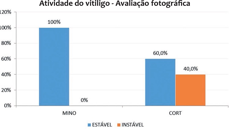 Resultados: De acordo com os registros fotográficos, houve controle da atividade do vitiligo em 100% dos pacientes do Grupo MINO em comparação a 60% do Grupo CORT Na comparação para o escore VIDA, notou-se diferença estatisticamente significante para ambos os grupos; porém, constatou-se que a redução foi maior no Grupo MINO, evidenciando maior efetividade da minociclina no controle da atividade do vitiligo.