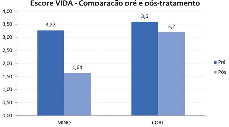 O presente estudo demonstrou que em ambos os tratamentos instituídos, tanto o Grupo MINO quanto o Grupo CORT apresentaram controle na atividade do vitiligo com significância estatística avaliada por meio do questionário VIDA. Contudo, comparando-se os grupos em cada momento do tratamento (pré e pós) e avaliando-se também o ganho (diferença simples entre a média dos resultados de pós menos pré-tratamento do escore VIDA), observou-se a existência de diferença estatisticamente significante entre os grupos avaliados, apontando para melhores efeitos no tratamento com minociclina do que com corticosteroide.