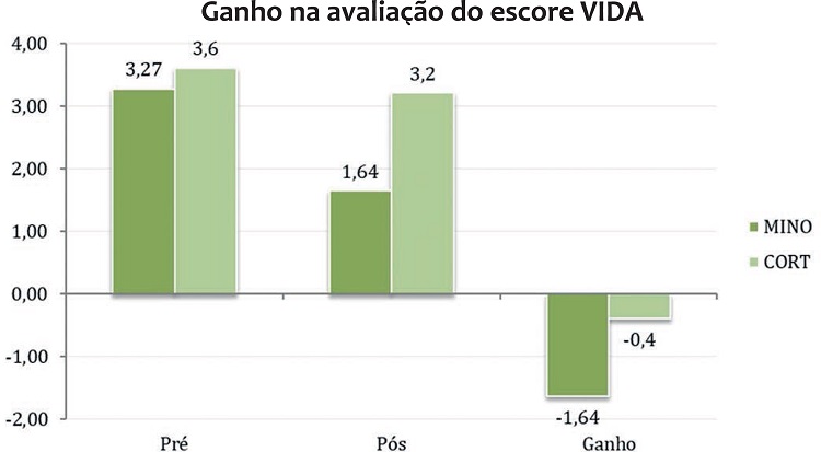 Analisaram-se também os grupos no ganho, ou seja, na diferença simples entre a média dos resultados de pós menos pré-tratamento dos dados do questionário VIDA, utilizando-se o teste de Mann-Whitney e concluindo-se existir diferença estatisticamente significante entre os grupos. A redução, porém, foi maior no Grupo MINO com -1,64 contra -0,40 do Grupo CORT (p-valor=0,004), evidenciando maior efetividade da minociclina no controle da atividade do vitiligo nesse grupo de pacientes (Gráfico 3).
