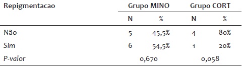 A tabela 1 mostra a distribuição com relação à repigmentação entre os Grupos MINO e CORT, evidenciando, como dado adicional, ao final do tratamento com minociclina, repigmentação em 54,5% dos pacientes em comparação a 20% do grupo em uso de prednisolona.