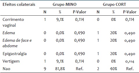 Nenhum paciente cursou com efeitos colaterais graves durante o estudo, sendo que estes foram mais frequentemente atribuídos ao uso da corticoterapia. Apenas dois dos 11 pacientes referiram efeitos colaterais associados ao uso da minociclina (corrimento vaginal e vertigem), como mostra a tabela 2.