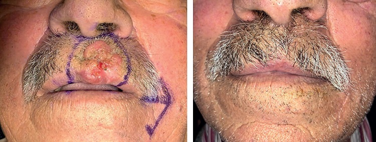 Caso 2: Homem de 82 anos com carcinoma espinocelular com 3cm no maior eixo, ocupando o terço médio do lábio superior. A excisão radical do tumor originou um defeito de espessura total do lábio atingindo quase metade da sua extensão (Figura 2). Foi realizado um retalho de Yu unilateral invertido sob bloqueio nervoso infraorbitário bilateral.
