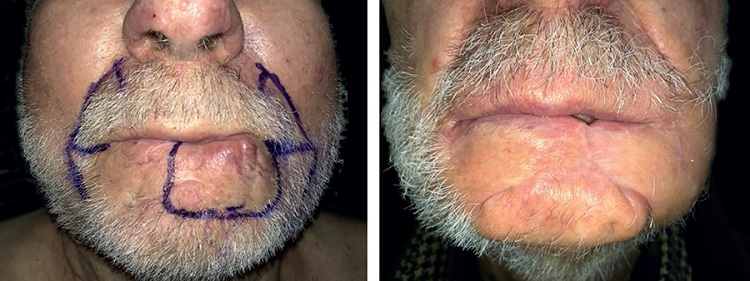 Caso 1: Mulher de 90 anos. Tumor com 2cm, de superfície erosivo-crostosa, localizado ao 1/3 inferior esquerdo do lábio inferior, evoluindo desde há sete meses. A ressecção tumoral originou um defeito cirúrgico que ocupava mais de 1/3 da extensão do lábio. Foi realizado um retalho de Yu unilateral sob bloqueio nervoso infraorbitário e mentoniano esquerdos (Figura 1).