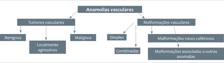 As malformações vasculares dividem-se em quatro grupos: malformações simples, combinadas, de grandes vasos e associadas a outras anomalias (ósseas, de tecidos moles, viscerais).1