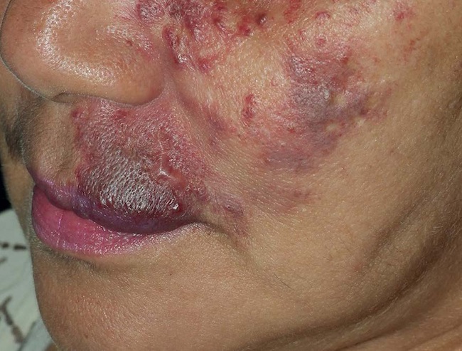 Apresenta-se como uma mácula ou placa de coloração rósea, vermelha ou purpúrica na pele, que escurece progressivamente caso não seja tratada de forma precoce e torna-se hipertrófica ou nodular com o avançar da idade em aproximadamente dois terços dos pacientes aos 50 anos de idade.8,10