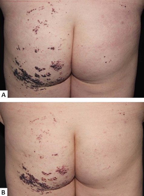 O laser de Nd:YAG também tem sido usado no tratamento de angioqueratomas.33 A figura 3 mostra resposta satisfatória de lesões localizadas em nádegas, com redução de sangramentos e infecções locais e consequente melhora da qualidade de vida da paciente.