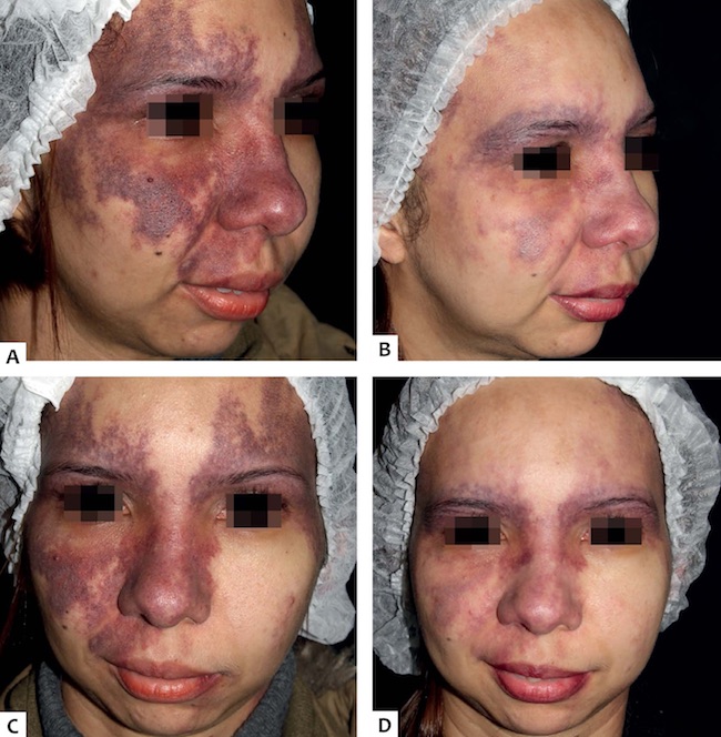 Quando localizadas em face e pescoço, essas manchas respondem melhor ao tratamento com laser, comparando-se às situadas em outras áreas corpóreas.12 As lesões mais espessas representam maior dificuldade terapêutica. Por isso, o tratamento deve ser feito precocemente, antes do espessamento das mesmas e como forma de prevenir o desenvolvimento de problemas psicossociais decorrentes do prejuízo funcional ou estético que as lesões causam.8,13