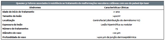 Existe uma heterogeneidade na resposta das malformações vasculares cutâneas às terapias disponíveis e são descritos alguns fatores que influenciam a imprevisibilidade e resistência ao tratamento com o pulsed dye laser (Quadro 3).10 Lesões centrofaciais, situadas no trajeto do dermátomo V2, apresentam resposta inferior àquelas localizadas nos terços superior e inferior da face, correspondentes aos dermátomos V1 e V3, respectivamente.10,26 Além disso, até um terço dos pacientes não responde ao tratamento, a despeito da realização de múltiplas sessões. Lesões localizadas nas pernas e mãos são menos responsivas ao tratamento com o PDL quando comparadas às faciais.13