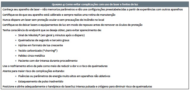 Embora o laser e outras fontes de luz representem medidas eficazes no tratamento de malformações vasculares cutâneas, alguns cuidados devem ser tomados a fim de se evitarem efeitos indesejados com seu uso. O quadro 4 apresenta medidas a serem adotadas para redução do risco de complicações com uso de laser e luz intensa pulsada, baseadas na literatura e prática clínica.37