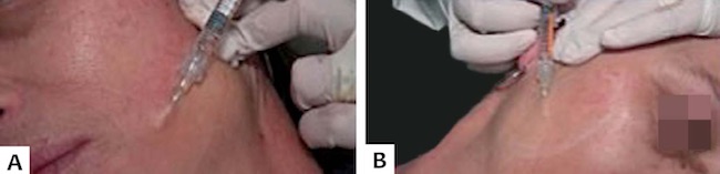 Técnicas de preenchimento com injeções intradérmicas profundas ou subdérmicas são especialmente pertinentes para géis menos reticulados e/ou com baixas concentrações de ácido hialurônico, que estão indicados para tratar diretamente as rugas finas em áreas como a região periorbitária ou perioral.As aplicações devem ser feitas nas profundidades indicadas pelo risco de efeito Tyndall ou de visualização do material injetado.