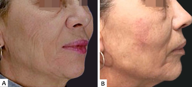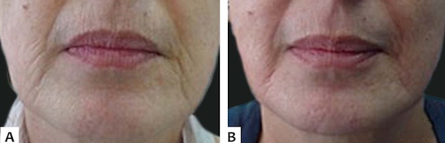 As aplicações foram realizadas em 40 pacientes do sexo feminino, com idades entre 55 e 80 anos (idade média de 70,4 anos).A melhora das linhas foi imediata em todos os casos (Figuras 3-6). Em algumas pacientes, duas aplicações foram necessárias (Figura 7), de acordo com o grau de atrofia cutânea, profundidade das linhas e vincos, ou se o aumento de volume da área tratada fosse um objetivo almejado que pôde ser conseguido de maneira uniforme e gradual, resultando em um aspecto bastante natural.As pacientes tratadas mostraram-se bastante satisfeitas com os resultados, avaliando o grau de melhora. Os efeitos alcançados mantiveram-se por, pelo menos, um ano (Figura 7C).