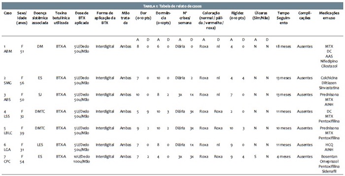 As doses aplicadas foram de 10UI/dedo em um caso (14,3%) e 5UI/ dedo em seis casos (85,7%). Todos os sete pacientes possuíam FR secundário a colagenoses (100%), sendo um caso de dermatomiosite (14,3%), um de lúpus eritemato- so sistêmico (14,3%), dois de esclerodermia sistêmica (28,55%), dois de doença mista do tecido conectivo (28,55%) e um de síndrome de Sjögren (14,3%). Os dados demográficos estão apresentados na tabela 1.