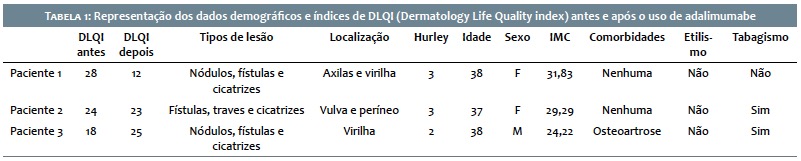 Após a exclusão, foram avaliados três pacientes em uso de adalimumabe para tratamento de HS. Dois pacientes eram estadiados como Hurley 3 e um como Hurley 2. Um paciente apresentava lesões inguinais e perineais, um apresentava lesões inguinais e axilares e o último apresentava lesões nas regiões inguinais, axilares e também na região retroauricular. Duas pacientes eram do sexo feminino e um paciente do sexo masculino, todos com idade entre 37 e 38 anos. Um paciente encontrava-se com peso adequado para a altura, um paciente com sobrepeso e um com obesidade grau I. Dois pacientes eram tabagistas e nenhum apresentava história de etilismo. Apenas um paciente apresentava outras comorbidades (osteoartrose). Todos apresentavam DLQI maior que 10 antes do início do tratamento, sendo que um apresentou queda de 16 pontos nesse índice após 20 semanas de tratamento, um apresentou queda de um ponto após 32 semanas de tratamento, e outro aumento de sete pontos após 48 semanas de tratamento (Tabela 1).