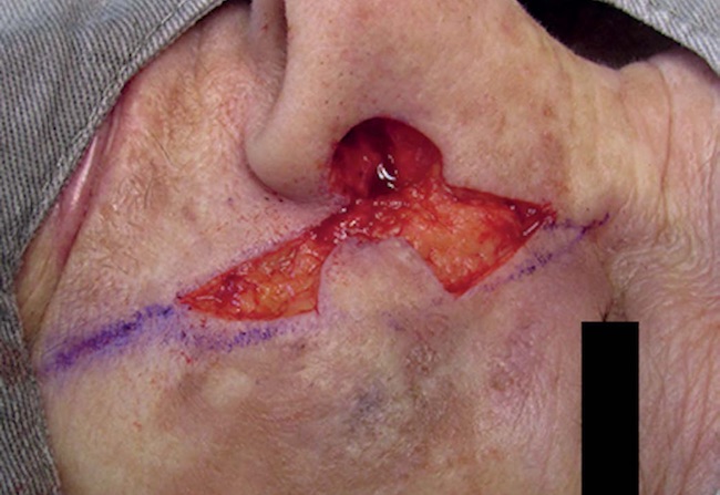 A região nasal é local comum para ocorrência de CPNM, e a ressecção cirúrgica total da lesão é o método de escolha para o seu tratamento.5 As necessidades funcionais, as características anatômicas e a relevância estética das regiões alar e perialar do nariz configuram-se frequentemente em desafio ao cirurgião dermatológico na reconstrução de defeitos cirúrgicos dessa região.