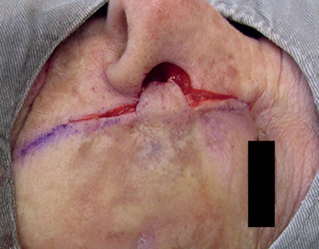 Foi realizada a excisão da lesão resultando em defeito cirúrgico profundo de 13mm na região perialar. Desenhado retalho de avanço com os triângulos de compensação inferiormente ao longo do sulco nasogeniano e superiormente ao longo do limite entre as unidades anatômicas nasal e malar. (Figura 1). O retalho é incisado, e os triângulos de compensação são removidos. O retalho tem pedículo randômico e base lateral.A gordura subjacente é removida do retalho para deixá-lo com a espessura do defeito cirúrgico. Os defeitos secundários resultantes da excisão dos triângulos de compensação são fechados com suturas subcutâneas absorvíveis. São realizados pontos de ancoragem fixando-se parte do retalho no periósteo do osso maxilar e forame piriforme. O fechamento é concluído com a execução de suturas cutâneas com fio de nylon. (Figura 2)
