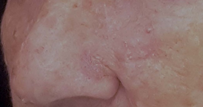Paciente do sexo feminino, 72 anos, fototipo III, apresentava lesão localizada na região perialar esquerda (Figuras 3 e 4) caracterizada por pápula de 8mm, com bordas perláceas e dermatoscopia típica. Foi confirmado diagnóstico de carcinoma basocelular por exame anatomopatológico.