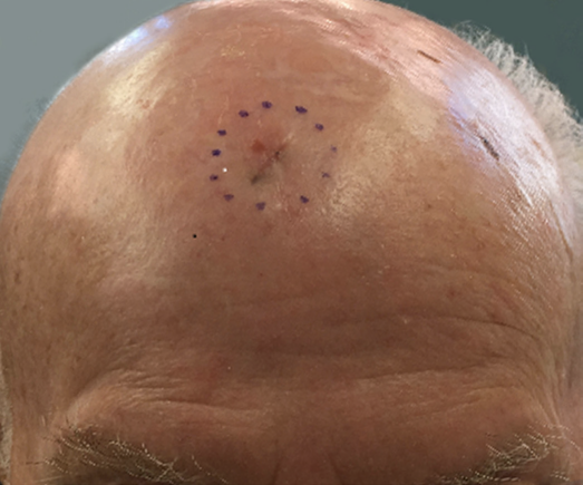 Paciente branco de 72 anos, do sexo masculino, compareceu à consulta para avaliação, com história de dois meses de lesão assintomática, não pigmentada, no couro cabeludo (Figura 1). O exame físico revelou uma pápula endurecida, mal demarcada, medindo 7mm de diâmetro, localizada no couro cabeludo, próxima à região frontal.