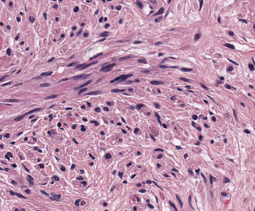 O melanoma desmoplásico, descrito pela primeira vez por Conley et al4 em 1971, é caracterizado pela proliferação invasiva de células fusiformes na derme, com comprometimento frequente de partes mais profundas e com deposição variável de colágeno no estroma (desmoplasia).1,2,5 O MD frequentemente apresenta neurotropismo, com padrão de crescimento semelhante ao neuroma.1,6