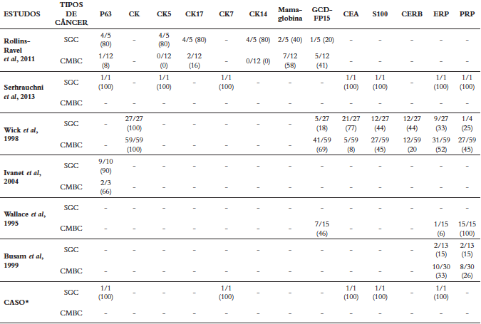 O diagnóstico deste caso foi possível após descartar foco neoplásico extracutâneo, pela presença da lesão isolada no couro cabeludo, associado ao estudo imuno-histoquímico. Os achados dos dois estudos imuno-histoquímicos mostraram CK7+, P63+, CK18+, CEA+. Ainda não existe um padrão para a imuno-histoquímica baseado em evidências, tendo em vista a raridade do tumor. Contudo, nos trabalhos existentes, a presença dos marcadores acima é favorável a tumor primário de glândula écrina e menos frequente no câncer de mama, conforme a tabela abaixo (Tabela 1).