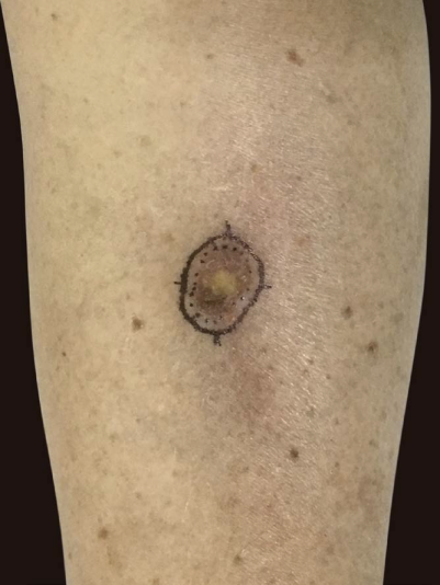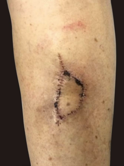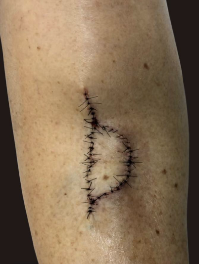 Paciente feminina, 92 anos, apresentando lesão nodular hiperceratótica de aproximadamente 2cm no maior diâmetro na face anterior da perna esquerda com biópsia evidenciando carcinoma espinocelular in situ (Figura 1), sem tratamentos prévios. Submetida à cirurgia micrográfica de Mohs, livre de tumor no primeiro estágio (Figura 2). Para fechamento primário, foi utilizada a técnica Keystone, com uma aba curvilínea de mesma largura do defeito e com ângulos de 90º nos cantos da área de exérese do tumor. Avançando a aba no defeito primário, resulta num defeito secundário que é mais longo e estreito. Perpendiculares ao avanço do retalho, as duas bordas periféricas foram avançadas em V-Y e a aba, avançada sobre o defeito, sendo suturado com fio nylon 4-0 (Figuras 3 e 4). A paciente apresentou boa evolução, sem complicações pós-operatórias (Figura 5).