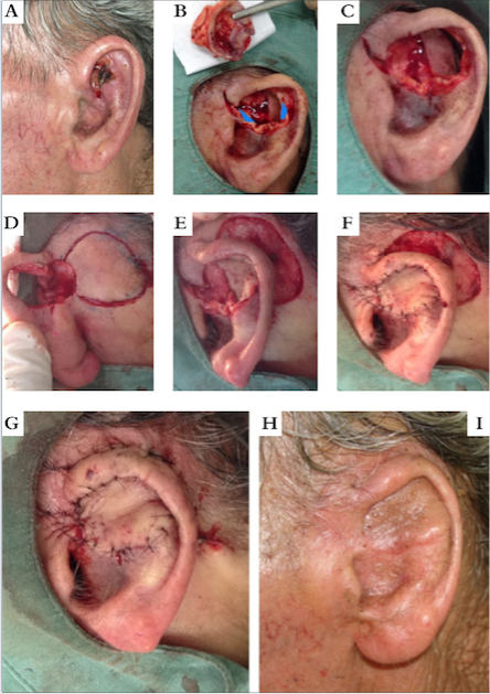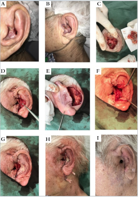 Paciente feminina, 85 anos, apresentava extenso carcinoma basocelular infiltrativo acometendo toda a concha auricular, estendendo-se até o meato auditivo externo, tragus, ramo da hélice e anti-hélice (Figuras 2A e 2B). Ressonância magnética prévia mostrou-se sem evidências de invasão de estruturas profundas (vasculares e neurais). Sob anestesia local com bupivacaína e sedação, foi submetida à cirurgia micrográfica de Mohs, com excisão total do tumor no segundo estágio. O procedimento resultou em extenso e complexo defeito cirúrgico de espessura total, com cartilagem, tecido subcutâneo e terço distal do conduto auditivo externo acometidos (Figura 2C). Optou-se por fechamento com retalho de pele retroauricular com rotação anterior através do defeito primário. Inicialmente, foi realizado fechamento da porção anterior do defeito com retalho de avanço pré-auricular, seguido de incisão na porção central para recriar o meato auditivo externo (Figura 2D). Na sequência, fez-se incisão semilunar posterior ao sulco retroauricular (Figura 2E) e, após descolado o retalho, este foi rebatido anteriormente através do defeito cirúrgico (Figura 2F) e suturado junto à concha (Figura 2G). Em seguida, foi realizada uma incisão fusiforme longitudinal na região posterior do retalho, de modo que a borda anterior fosse rotada em direção ao conduto auditivo, ao encontro do retalho de avanço pré-auricular, e a borda posterior em direção à região mastóidea, fixando a face posterior da orelha. Manteve-se o dreno nos primeiros sete dias de pós-operatório para evitar formação de coleções (Figura 2H), e houve evolução com bom resultado estético e funcional (Figura 2I).