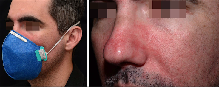 Na face, por pressão da máscara, pode ocorrer a formação de sulcos que demoram dias para desaparecer, escoriações da pele por atrito constante, áreas eritematosas que evoluem com hiperpigmentação pós-inflamatória e edemas palpebrais adjacentes ou subjacentes às áreas de apoio dos EPIs.