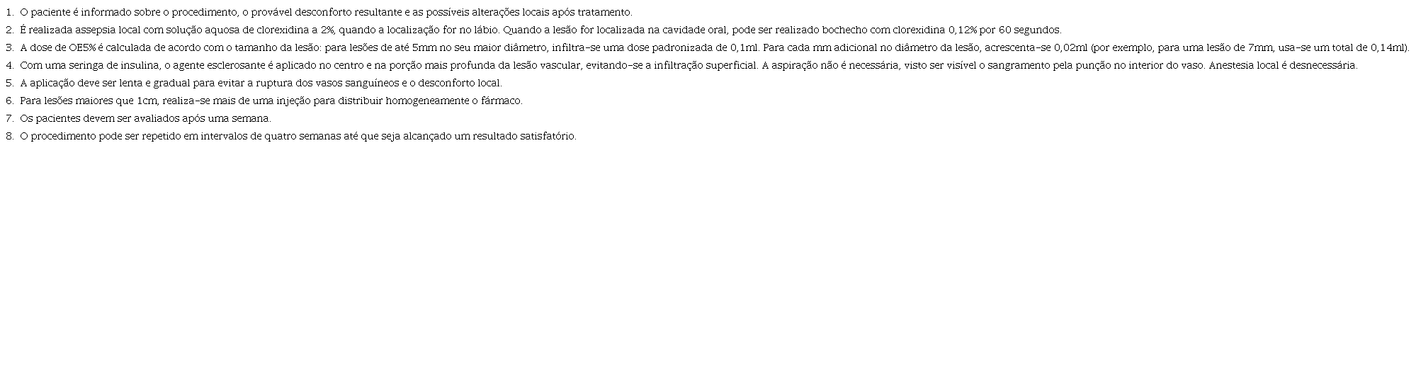 Descrevemos a seguir o protocolo de tratamento para lago venoso oral que utiliza OE5% como agente esclerosante (Ethamolin®, Farmoquímica - Brasil). A técnica foi utilizada em 10 pacientes consecutivos no atendimento do Ambulatório de Estomatologia do Departamento de Dermatologia da UNIFESP durante o ano de 2019 (Quadro 1).