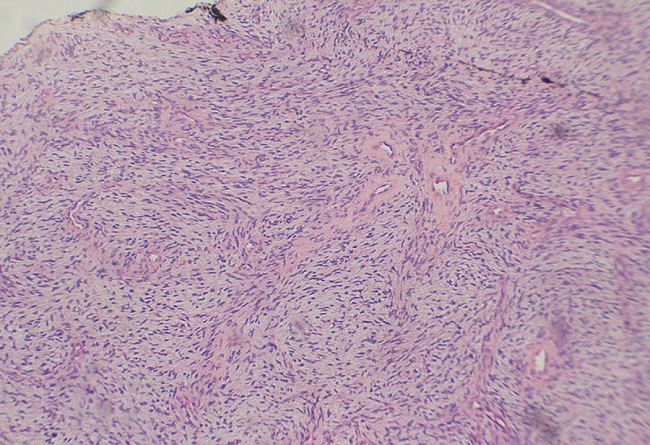 O exame histopatológico mostra uma coleção densa uniforme de células fusiformes em arranjo estoriforme (em turbilhão ou semelhante a uma esteira) característico, com pouco pleomorfismo nuclear e baixa atividade mitótica. O tumor pode infiltrar o subcutâneo distorcendo a arquitetura do tecido adiposo, com aspecto em favo de mel. Projeções profundas em direção a fáscia e músculo dificultam sua delimitação e consequente remoção cirúrgica.3,5,6