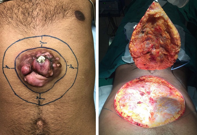 O tratamento com maiores chances curativas é a ressecção cirúrgica com excisão local ampla. A disseminação microscópica do tumor por projeções de células tumorais, semelhantes a tentáculos, sob a pele clinicamente normal, torna difícil a remoção cirúrgica completa da lesão. Quando possível de ser realizada, a cirurgia micrográfica de Mohs apresenta as maiores taxas de cura para esse tumor.1,3 No caso em questão, optou-se pela cirurgia convencional com amplas margens cirúrgicas feita pela cirurgia plástica devido à grande extensão da lesão.
