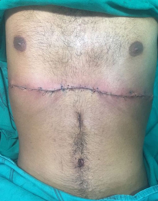 A lesão foi excisada pela equipe de cirurgia plástica, com margem ampla de 3cm, com retirada da fáscia do músculo reto abdominal e fechamento da parede por abdominoplastia reversa, apresentando bom resultado estético (Figuras 4 e 5). Conforme discutido com patologista, o anatomopatológico da peça cirúrgica foi compatível com DFSP, com fragmentos da fáscia muscular livres de neoplasia, e foi afastada a possibilidade de transformação mais agressiva na peça analisada.