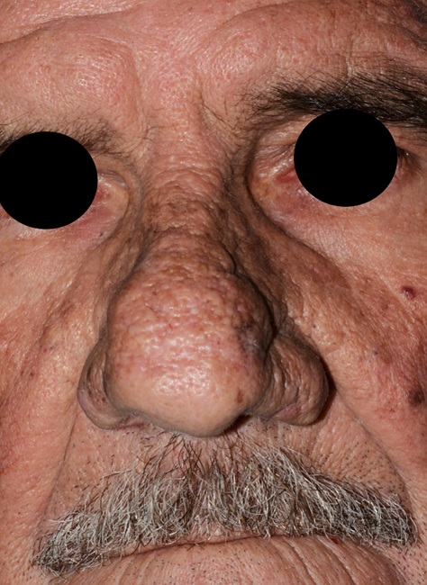 Clinicamente, o rinofima manifesta-se com aumento do nariz com textura irregular, dilatação de poros e telangiectasias.2 Esses achados correspondem, na histopatologia, à hiperplasia sebácea, à dilatação do infundíbulo e ao infiltrado linfo-histiocitário circundante.2 Nos estágios mais avançados, os contornos nasais encontram-se distorcidos e com perda da demarcação entre as suas subunidades, podendo, inclusive, comprometer as vias aéreas respiratórias.2,3