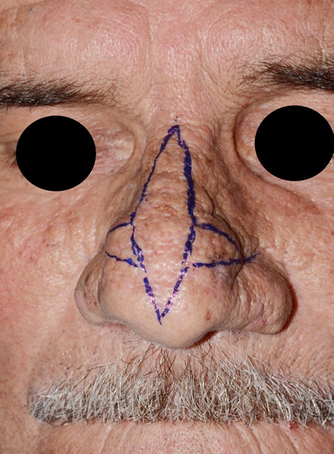 RESUMO: Rinofima é uma doença desfigurante e progressiva do nariz, com alta prevalência. Apesar de ser considerada benigna, muitos pacientes têm procurado tratamentos curativos devido a deformidade estética e estigmatização social. Existem diversas técnicas cirúrgicas descritas para o tratamento desta doença. O objetivo deste relato é apresentar um caso que necessitou de abordagem terapêutica pouco utilizada para tratamento de rinofima devido às múltiplas comorbidades do paciente. O procedimento foi realizado sem complicações no intra e pós-operatório, e o paciente mantém seguimento ambulatorial com bom resultado estético final a longo prazo.