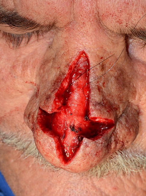 As primeiras descrições de tratamento cirúrgico para rinofima foram apresentadas por Friedrich Dieffenbach em 1845, que excisou a pele fimatosa realizando uma incisão vertical na ponta nasal e uma horizontal em ambos os sulcos alares nasais, procedendo, posteriormente, ao fechamento primário da lesão.4,5 Esta técnica de ressecção em cruz para redução do volume nasal é um procedimento rápido, com pouco sangramento e baixo risco de complicações, com a vantagem de retirar parte do tecido hipertrófico, proporcionar bom resultado estético para o paciente e, o mais importante, propiciar uma rápida recuperação.5