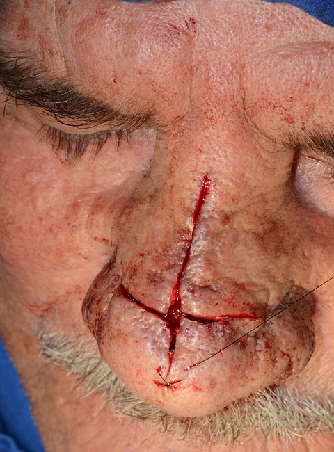 A realização de excisão em cruz e fechamento primário demonstrou ser ótima opção com resultado muito satisfatório em pacientes com múltiplas comorbidades. Relata-se uma técnica cirúrgica simples, segura, eficiente e pouco relatada para o tratamento do rinofima.