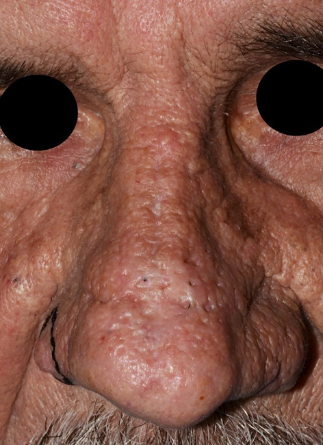 Homem de 68 anos, com queixa de aumento nasal progressivo com superfície irregular, dilatação de poros e telangiectasias (Figura 1). Relatava incômodo estético e prejuízo social. Optou-se, então, por tratamento cirúrgico. Como apresentava diversas comorbidades, como transplante cardíaco em uso de imunossupressores e antiagregantes plaquetários, aneurisma de aorta abdominal e hipertensão arterial, foi necessário optar por uma abordagem cirúrgica rápida, com pouco sangramento e com menor risco de complicações. Foi realizada excisão da pele fimatosa por incisão vertical na ponta e dorso nasal e um corte horizontal no sulco alar, em cruz, para reduzir o tecido hipertrófico e o nariz (Figuras 2 a 4), seguido por fechamento primário da lesão, inicialmente com sutura interna aproximando as bordas da ferida operatória e, após, sutura externa. Não houve intercorrências imediatas ou recidiva do quadro durante o seguimento de 36 meses (Figura 5).