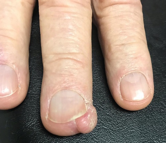 Tipicamente, apresenta crescimento lento, indolor ou pouco sintomático, porém pode causar deformidades nas unhas devido ao comprometimento de leito ungueal e não costuma ter relação com traumatismos prévios.