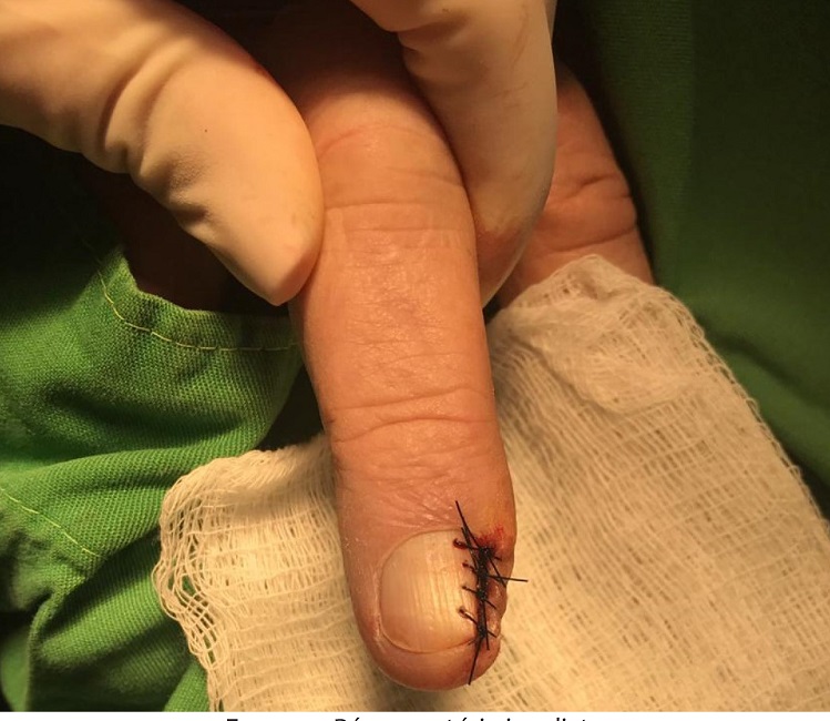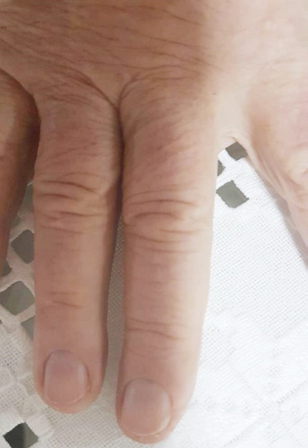 Reportamos o caso de um paciente do sexo masculino, 66 anos, ex-etilista e ex-tabagista, diabético, hipertenso e cardiopata isquêmico, com lesão nodular na face lateral do terceiro quirodáctilo direito, de consistência fibroelástica, não móvel, assintomática e com crescimento progressivo há cinco anos. Após avulsão lateral da placa ungueal foi realizada biópsia excisional elíptica da face lateral do dedo permitindo ressecar o tumor com margens de segurança (Figuras 1,2,3, e 4).
