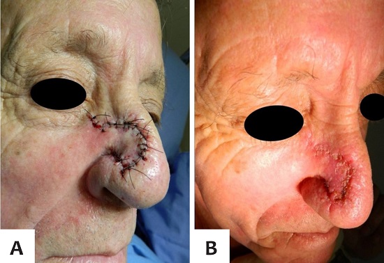 Quanto às lesões excisadas na região nasal, opções para reparo do defeito cirúrgico envolvem cicatrização por segunda intenção, fechamento primário, retalhos e enxerto cutâneo.6 A cicatrização por segunda intenção é subutilizada5,8, entretanto possui inúmeras vantagens, incluindo ótimos resultados estéticos, sendo os melhores quando em áreas côncavas do nariz e em lesões mais superficiais e menores que 2cm.5 Além disso, é útil para pacientes que não tolerariam procedimento reconstrutivo.5 As feridas cicatrizadas continuam a melhorar a aparência ao longo do tempo.8