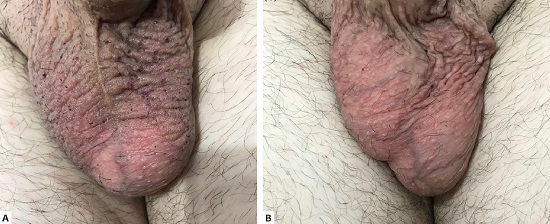 Paciente masculino de 37 anos, fototipo III, apresentou múltiplas pápulas violáceas indolores na bolsa escrotal. Ao exame, apresentava mais de 50 pápulas violáceas, com 2-3mm de diâmetro em cada lado do escroto, compatíveis com angioqueratomas de Fordyce (Figura 1A). O paciente referia cirurgia de varicocele realizada há sete anos. Não havia evidência de tumor testicular nem hérnia inguinal. Ele havia tentado tratar o problema alguns meses antes, com pouca resposta, e desejava obter uma melhora maior. Antes do procedimento, um creme anestésico contendo lidocaína a 23% e tetracaína a 7% foi aplicado e removido completamente após 60 minutos com sabão e solução de clorexidina. O paciente recebeu uma única sessão de tratamento com laser Nd: YAG pulso longo (Solon Platform®, LMG Lasers) no comprimento de onda de 1064nm, com spot de 3mm, energia 212J e duração de pulso de 15ms. O ponto final alcançado foi o escurecimento dos vasos. Pudemos observar redução das lesões um mês após o procedimento, e o paciente ficou satisfeito com os resultados alcançados (Figura 1B). Além disso, foi visível a melhora da qualidade da pele após a realização do procedimento.