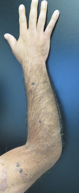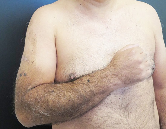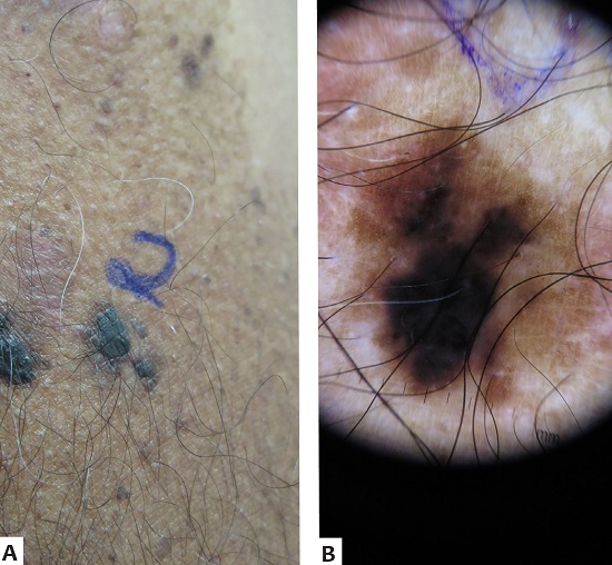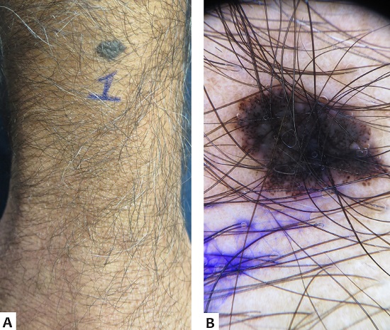 Paciente masculino, branco, 48 anos, apresentando nevo congênito gigante no membro superior direito (MSD) com queixa de lesões enegrecidas assintomáticas sobre o nevo há dois anos. Ao exame dermatológico, evidenciava-se mácula acastanhada acometendo todo o MSD, com aumento da pilificação local, sobreposta por pápulas enegrecidas com bordas irregulares (Figuras 1 e 2).