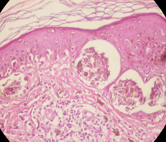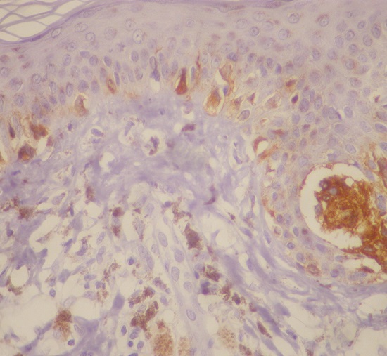 Devido à presença na primeira consulta de duas lesões melanocíticas suspeitas no MSD (Figuras 3 e 4), foi aventada a hipótese diagnóstica de melanoma com metástases em trânsito, optando-se pela realização de biópsia excisional, com margem de 2mm, das duas lesões. Em seguida, foi realizada a ampliação das margens das lesões previamente retiradas em serviço externo e solicitados os exames de estadiamento (tomografia de tórax, abdome total e pesquisa de linfonodo sentinela). Os anatomopatológicos das duas lesões evidenciaram melanoma maligno de padrão in situ (Figuras 5 e 6), e os exames de estadiamento não mostraram sinais de acometimento neoplásico.