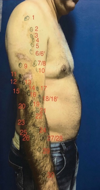 Após seis meses, foram identificadas três novas lesões melanocíticas suspeitas no MSD com anatomopatológico revelando melanoma maligno in situ sem ulceração e, após mais três meses, devido ao grande número de novas lesões suspeitas, foi indicada a realização de mapeamento fotográfico e biópsia excisional de todas as lesões sobre o nevo (Figura 7). No total, foram realizadas 30 biópsias excisionais, sendo que duas revelaram melanoma in situ, nível I de Clark, ambas sem ulceração, sendo então realizada ampliação das margens e seguimento clínico rigoroso em conjunto com as equipes de Oncologia e Cirurgia Plástica.