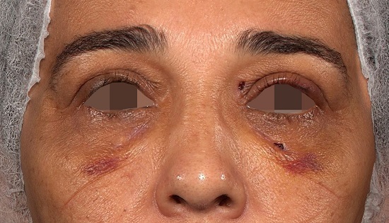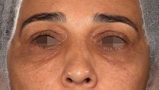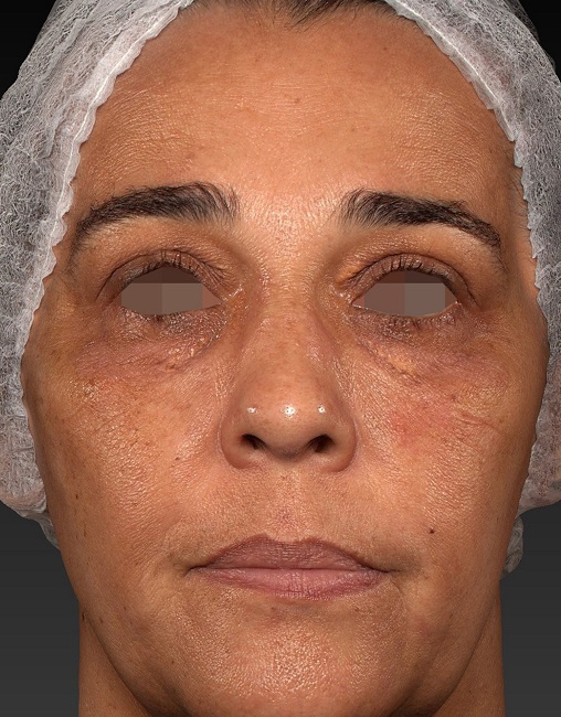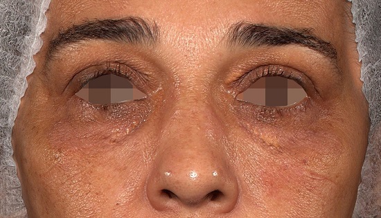 Paciente do sexo feminino, 51 anos, casada, fototipo IV de Fitzpatrick, referia placas amareladas, de localização bipalpebral há aproximadamente 14 anos. Negava comorbidades e doenças prévias ou quadros familiares semelhantes. Ao exame físico, apresentava placa xantomatosa de aproximadamente 2cm em seu maior diâmetro na pálpebra superior e de aproximadamente 1,2cm em seu maior diâmetro na pálpebra inferior, ambas no olho esquerdo, além de pápulas xantomatosas com tendência à confluência na pálpebra inferior do olho direito (Figura 1). A paciente referia ter se submetido a duas correções cirúrgicas prévias. Aos exames laboratoriais, apresentava elevação discreta nos níveis de colesterol total (232gm/dL). Após obtenção do consentimento informado, a paciente foi submetida ao tratamento das lesões com o laser Er: YAG 555 (Fotona® Dallas, Texas) em modo lesões benignas, com comprimento de onda de 2940nm, 5J de energia, velocidade de entrega de 7Hz e ponteira de 3mm. A paciente foi submetida a uma única sessão com tolerância álgica excelente a partir do uso de anestésico tópico de tetracaína 3,5% associada à lidocaína 10%, veiculado em base transdérmica com tempo de ação pré-procedimento de 30 minutos. Foram realizadas fotografias seriadas: imagens prévias (Figura 2), sete dias após o procedimento (Figura 3) e dois meses após o procedimento (Figura 4). Os registros foram realizados com o equipamento Vectra® H2 2019. Houve regressão completa das lesões e cicatrização em 20 dias, com hipocromia discreta, intervalo de tempo inferior e melhor recuperação quando comparados aos procedimentos cirúrgicos prévios, assim como menor risco de sangramentos peri e pós-operatórios. Houve melhora significativa da qualidade de vida avaliada pelo questionário de qualidade de vida, o DLQI (Dermatology Life Quality Index).