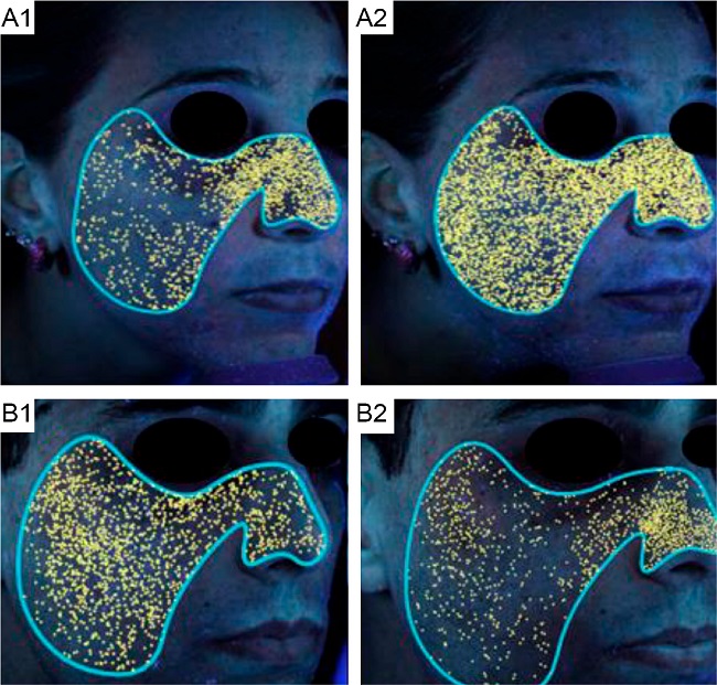 Resultados: os grupos foram homogêneos quanto à idade, sexo e fototipo. Na avaliação clínica, houve redução dos escores de gravidade para ambos os grupos. A análise multiespectral revelou redução das porfirinas (p=0,0296) e melhora da textura da pele, ambas para o grupo 2.