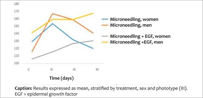 Methods: Randomized double-blind clinical trial of 30 patients divided into two groups: (1) - two microneedling sessions with a 30-day interval, (2) - two microneedling sessions with the same interval but associated with EGF drug delivery. The patients were evaluated clinically (global acne scarring grading system - Goodman and Baron) global acne scarring grading system via multispectral image and through self-perception questionnaires. The statistical analysis (Student T-test, SNK test, analysis of variance) was performed with the SisVar software (UFLA, 1996).