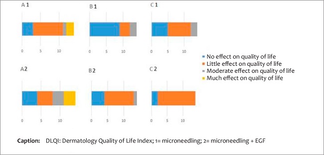 DLQI is a questionnaire that assesses skin diseases in general and grades them according to the following score: 1 (0-1 point) the skin disease does not interfere with the patient’s quality of life; 2 (2-5 points), the skin disease interferes little with the quality of life; 3 (6-10 points), the interference is moderate; 4 (11-20 points), there is a lot of interference in the quality of life; and 5 (21-30 points), there is huge interference in the quality of life of those affected. The results showed no significant differences in the total variation of scores (final score - initial score) for both treatments used (p=0.25 for treatment one and p=0.12 for treatment two). Before the intervention (time zero or baseline), of the 28 patients who participated of the study, 7 (25%) were classified as score 1; 12 (42.85%) as score 2; 4 (14,28%) patients as score 3; 5 (17.85%) as score 4; and no patient was classified as score 5 (n=28). Based on the stratification of the groups by treatment, in treatment one (microneedling), 3 (21.42%) patients were classified as grade 1; 8 (57.14%) as grade 2; 1 (7.14%) as grade 3; and 2 (14.28%) as grade 4 (n=14). For treatment two (microneedling associated with drug delivery of EGF), 4 patients (25.57%) were classified as grade 1; 4 (25.57%) as grade 2; 3 (21.42%) as grade 3; and 3 (21, 42%) as grade 4 (n=14). At the end of the treatment, 7 (25%) patients scored 1; 19 (67.85%) scored 2; 3 (10.71%) scored 3; and no patients scored 4 and 5, considering the population studied (n=28). Based on the stratification of the groups by treatments, in treatment one (microneedling), 5 (35.71%) patients were classified as grade 1; 7 (50%) as grade 2; and 2 (14.28%) as grade 3 (n =14). For treatment two (microneedling associated with drug delivery of EGF), 2 (14.28%) patients were classified as grade 1 and 12(85.71%) as grade 2 (n=14) (Chart 2).