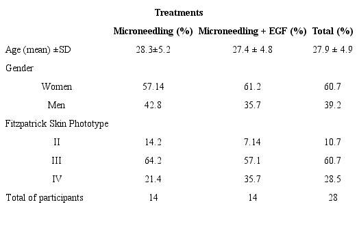 The simple stratified sampling method with stratification defined for four groups, aiming to meet the analysis domains established for the study (treatment strategies: one [microneedling] and two [microneedling associated with EGF drug delivery], in addition to gender [man and woman]), was used as a strategy to reduce the coefficient of variation and, thus, allow intragroup and intergroup comparisons over time. Therefore, each individual became his or her control over time.